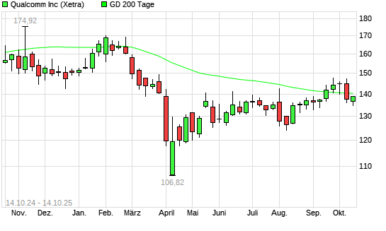 Mit dem Anstieg auf 139,88 EUR hat die Qualcomm-Aktie am 13.10.2025 die 200-Tage-Linie nach oben gekreuzt.