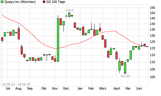 Mit dem Anstieg auf 121,75 EUR hat die Qualys-Aktie am 17.06.2025 die 100-Tage-Linie nach oben gekreuzt.