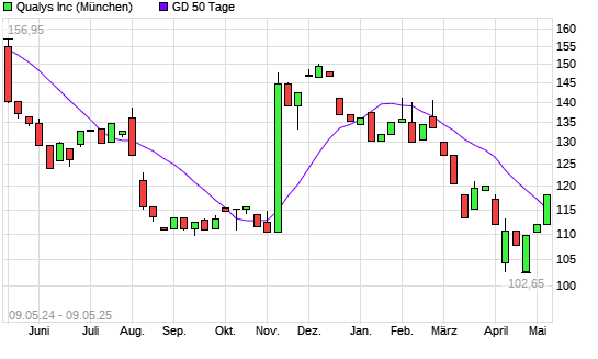 Mit dem Anstieg auf 118,70 EUR hat die Qualys-Aktie am 08.05.2025 die 50-Tage-Linie nach oben gekreuzt.