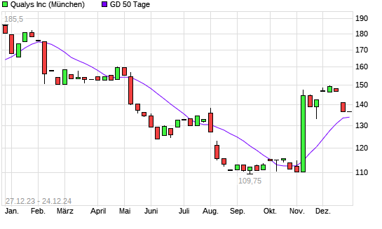 Mit dem Rücksetzer auf 133,30 EUR hat die Qualys-Aktie am 23.12.2024 die 50-Tage-Linie nach unten gekreuzt.