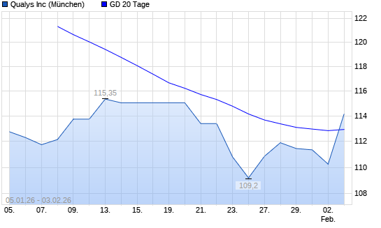 Mit dem Anstieg auf 113,90 EUR hat die Qualys-Aktie am 02.02.2026 die 20-Tage-Linie nach oben gekreuzt.Die Qualys-Aktie befindet sich seit dem 29.12.2025 im langfristigen Abwärtstrend ...weiterlesen