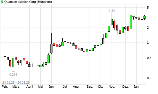 Mit dem Anstieg auf 3,48 EUR hat die Quantum eMotion-Aktie (ISIN CA74767K1030) am 23.01.2026 ein neues All-Time-High erreicht und damit den Kurs vom 22.01.2026 eingestellt.Der Abstand zur ...weiterlesen