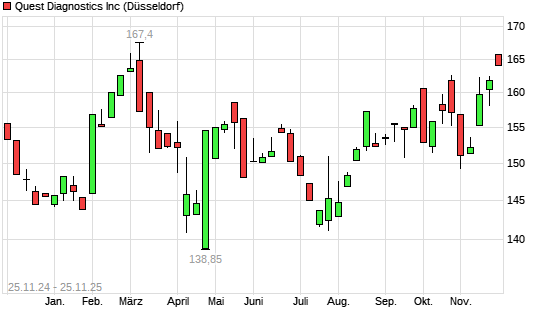 Mit dem Anstieg auf 165,20 EUR hat die Quest Diagnostics-Aktie (ISIN US74834L1008) am 24.11.2025 ein neues 6-Monats-Hoch erreicht und damit den Kurs vom 20.10.2025 eingestellt.