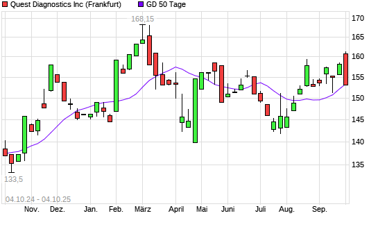 Mit dem Rücksetzer auf 153,00 EUR hat die Quest Diagnostics-Aktie am 03.10.2025 die 50-Tage-Linie nach unten gekreuzt.