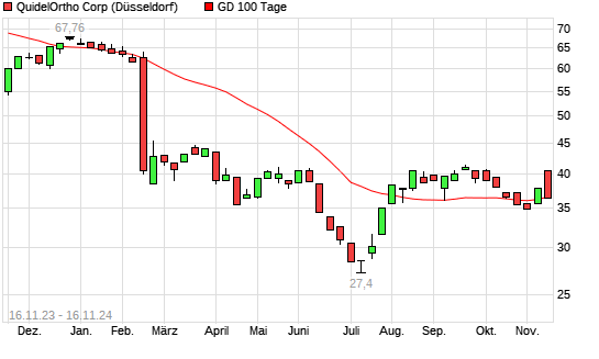 Mit dem Rücksetzer auf 34,60 EUR hat die Quidel-Aktie am 15.11.2024 die 100-Tage-Linie nach unten gekreuzt.