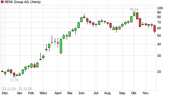 Mit dem Rücksetzer auf 53,55 EUR hat die RENK Group-Aktie (ISIN DE000RENK730) am 20.11.2025 ein neues 6-Monats-Tief erreicht und damit den Kurs vom 20.08.2025 eingestellt.