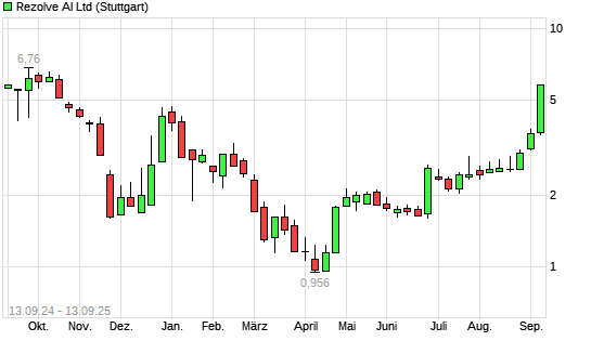 Mit dem Anstieg auf 6,06 EUR hat die REZOLVE AI-Aktie (ISIN GB00BQH8G337) am 12.09.2025 ein neues 6-Monats-Hoch erreicht und damit den Kurs vom 11.09.2025 eingestellt.