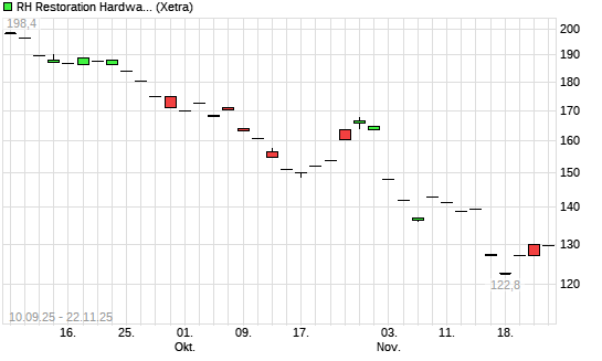 Mit dem Rücksetzer auf 115,20 EUR hat die RH-Aktie (ISIN US74967X1037) am 21.11.2025 ein neues 5-Jahres-Tief erreicht und damit den Kurs vom 19.11.2025 eingestellt.