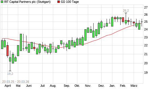 Mit dem Rücksetzer auf 24,80 EUR hat die RIT Capital Partners-Aktie am 19.03.2026 die 100-Tage-Linie nach unten gekreuzt.