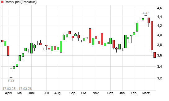 Mit dem Rücksetzer auf 3,60 EUR hat die ROTORK-Aktie (ISIN GB00BVFNZH21) am 16.03.2026 ein neues 6-Monats-Tief erreicht und damit den Kurs vom 12.03.2026 eingestellt.