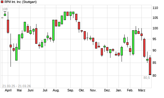 Mit dem Rücksetzer auf 82,50 EUR hat die RPM International-Aktie (ISIN US7496851038) am 20.03.2026 ein neues 12-Monats-Tief erreicht und damit den Kurs vom 09.03.2026 eingestellt.