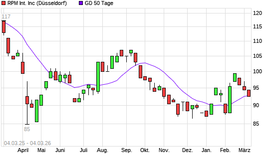 Mit dem Rücksetzer auf 93,00 EUR hat die RPM International-Aktie am 03.03.2026 die 50-Tage-Linie nach unten gekreuzt.Die RPM International-Aktie befindet sich seit dem 26.02.2026 ...weiterlesen