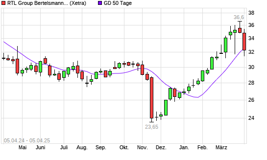 Mit dem Rücksetzer auf 32,35 EUR hat die RTL-Aktie am 04.04.2025 die 50-Tage-Linie nach unten gekreuzt.