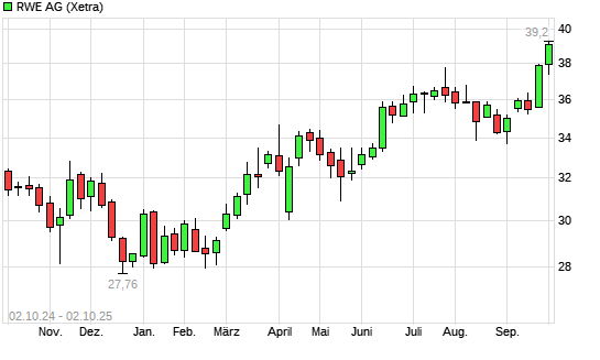 Mit dem Anstieg auf 39,04 EUR hat die RWE-Aktie (ISIN DE0007037129) am 01.10.2025 ein neues 12-Monats-Hoch erreicht und damit den Kurs vom 30.09.2025 eingestellt.