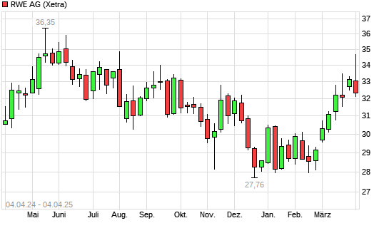 Mit dem Anstieg auf 34,18 EUR hat die RWE-Aktie (ISIN DE0007037129) am 03.04.2025 ein neues 6-Monats-Hoch erreicht und damit den Kurs vom 02.04.2025 eingestellt.