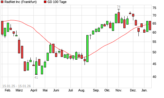 Mit dem Rücksetzer auf 63,00 EUR hat die RadNet-Aktie am 14.01.2026 die 100-Tage-Linie nach unten gekreuzt.