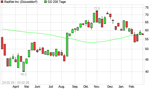 Mit dem Rücksetzer auf 58,50 EUR hat die RadNet-Aktie am 23.02.2026 die 200-Tage-Linie nach unten gekreuzt.