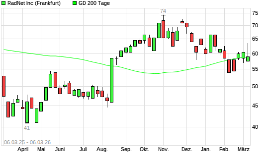 Mit dem Rücksetzer auf 59,00 EUR hat die RadNet-Aktie am 05.03.2026 die 200-Tage-Linie nach unten gekreuzt.