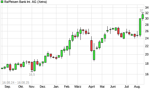 Mit dem Anstieg auf 31,14 EUR hat die Raiffeisen Bank-Aktie (ISIN AT0000606306) am 15.08.2025 ein neues 5-Jahres-Hoch erreicht und damit den Kurs vom 14.08.2025 eingestellt.
