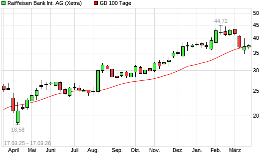 Mit dem Anstieg auf 37,46 EUR hat die Raiffeisen Bank-Aktie am 16.03.2026 die 100-Tage-Linie nach oben gekreuzt.