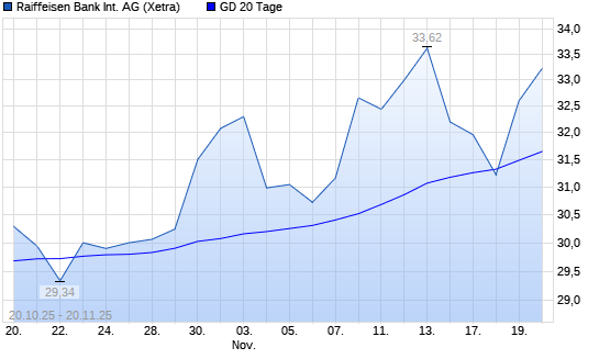 Mit dem Rücksetzer auf 30,70 EUR hat die Raiffeisen Bank-Aktie am 19.11.2025 die 20-Tage-Linie nach unten gekreuzt.
