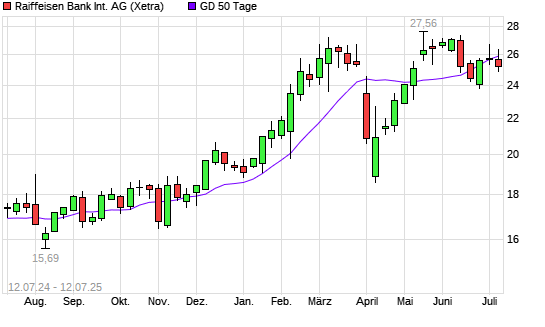 Mit dem Rücksetzer auf 25,74 EUR hat die Raiffeisen Bank-Aktie am 11.07.2025 die 50-Tage-Linie nach unten gekreuzt.