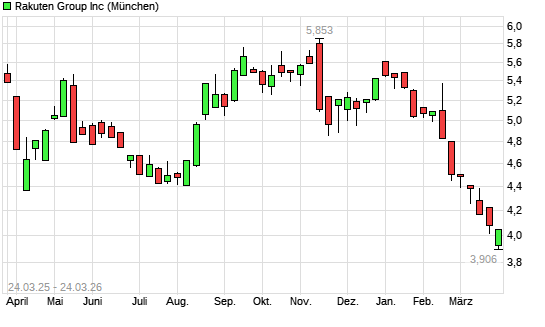 Mit dem Rücksetzer auf 3,90 EUR hat die Rakuten-Aktie (ISIN JP3967200001) am 23.03.2026 ein neues 12-Monats-Tief erreicht und damit den Kurs vom 19.03.2026 eingestellt.