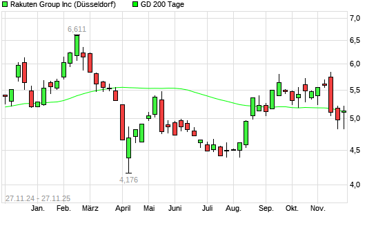 Mit dem Anstieg auf 5,20 EUR hat die Rakuten-Aktie am 26.11.2025 die 200-Tage-Linie nach oben gekreuzt.