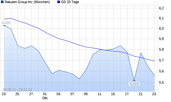 Mit dem Rücksetzer auf 5,69 EUR hat die Rakuten-Aktie am 22.10.2024 die 20-Tage-Linie nach unten gekreuzt.