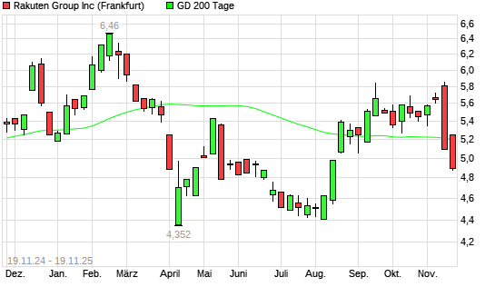 Mit dem Rücksetzer auf 4,88 EUR hat die Rakuten-Aktie am 18.11.2025 die 200-Tage-Linie nach unten gekreuzt.