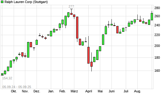 Mit dem Anstieg auf 265,55 EUR hat die Ralph Lauren-Aktie (ISIN US7512121010) am 04.09.2025 ein neues 6-Monats-Hoch erreicht und damit den Kurs vom 03.09.2025 eingestellt.