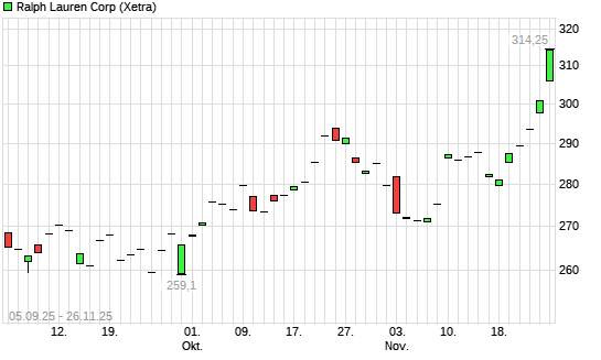 Mit dem Anstieg auf 300,00 EUR hat die Ralph Lauren-Aktie (ISIN US7512121010) am 25.11.2025 ein neues All-Time-High erreicht und damit den Kurs vom 24.11.2025 eingestellt.