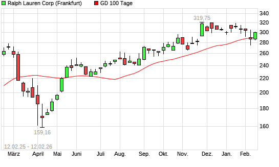 Mit dem Anstieg auf 298,70 EUR hat die Ralph Lauren-Aktie am 11.02.2026 die 100-Tage-Linie nach oben gekreuzt.