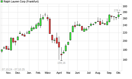 Mit dem Anstieg auf 273,35 EUR hat die Ralph Lauren-Aktie (ISIN US7512121010) am 06.10.2025 ein neues 6-Monats-Hoch erreicht und damit den Kurs vom 03.10.2025 eingestellt.Die Ralph Lauren-Aktie ...weiterlesen