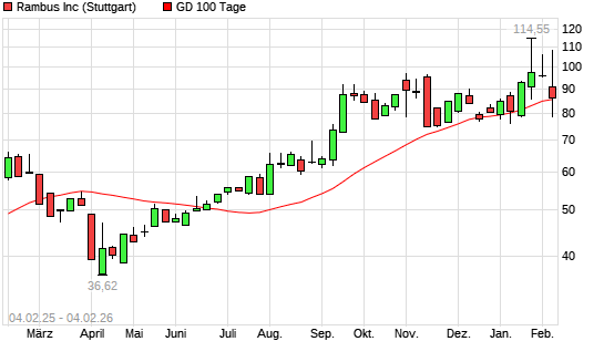 Mit dem Rücksetzer auf 81,74 EUR hat die Rambus-Aktie am 03.02.2026 die 100-Tage-Linie nach unten gekreuzt.
