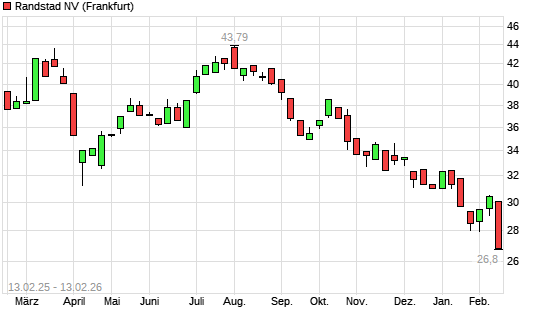 Mit dem Rücksetzer auf 27,10 EUR hat die Randstad-Aktie (ISIN NL0000379121) am 12.02.2026 ein neues 10-Jahres-Tief erreicht und damit den Kurs vom 11.02.2026 eingestellt.