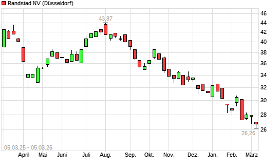 Mit dem Rücksetzer auf 26,10 EUR hat die Randstad-Aktie (ISIN NL0000379121) am 04.03.2026 ein neues 10-Jahres-Tief erreicht und damit den Kurs vom 03.03.2026 eingestellt.