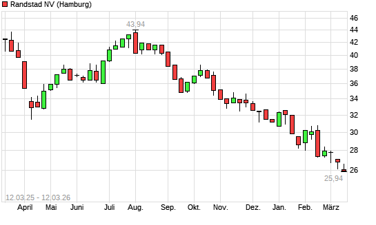 Mit dem Rücksetzer auf 25,88 EUR hat die Randstad-Aktie (ISIN NL0000379121) am 11.03.2026 ein neues 10-Jahres-Tief erreicht und damit den Kurs vom 04.03.2026 eingestellt.
