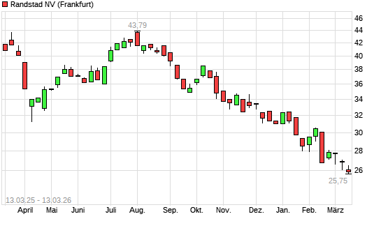 Mit dem Rücksetzer auf 25,75 EUR hat die Randstad-Aktie (ISIN NL0000379121) am 12.03.2026 ein neues 10-Jahres-Tief erreicht und damit den Kurs vom 11.03.2026 eingestellt.