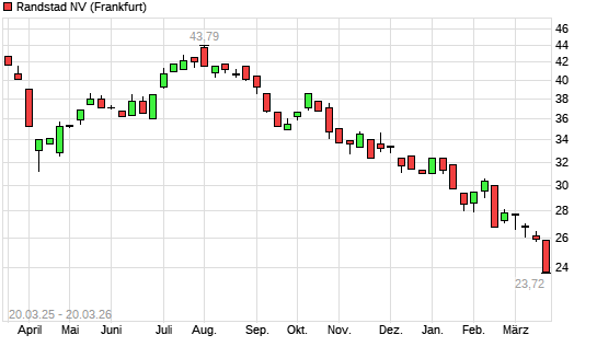 Mit dem Rücksetzer auf 24,28 EUR hat die Randstad-Aktie (ISIN NL0000379121) am 19.03.2026 ein neues 10-Jahres-Tief erreicht und damit den Kurs vom 18.03.2026 eingestellt.