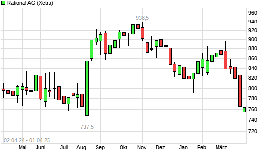 Mit dem Rücksetzer auf 755,00 EUR hat die Rational-Aktie (ISIN DE0007010803) am 31.03.2025 ein neues 12-Monats-Tief erreicht und damit den Kurs vom 10.07.2024 eingestellt.