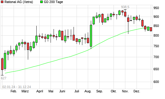 Mit dem Rücksetzer auf 829,50 EUR hat die Rational-Aktie am 30.12.2024 die 200-Tage-Linie nach unten gekreuzt.