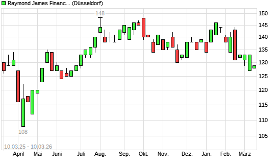 Mit dem Rücksetzer auf 126,00 EUR hat die Raymond James Financial-Aktie (ISIN US7547301090) am 09.03.2026 ein neues 6-Monats-Tief erreicht und damit den Kurs vom 27.02.2026 eingestellt.