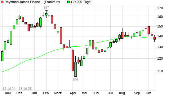 Mit dem Rücksetzer auf 137,00 EUR hat die Raymond James Financial-Aktie am 17.10.2025 die 200-Tage-Linie nach unten gekreuzt.