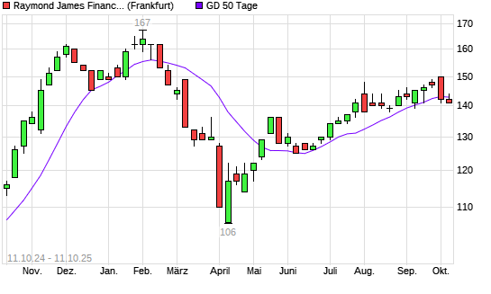 Mit dem Rücksetzer auf 141,00 EUR hat die Raymond James Financial-Aktie am 10.10.2025 die 50-Tage-Linie nach unten gekreuzt.
