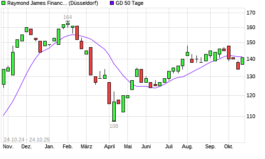 Mit dem Rücksetzer auf 139,00 EUR hat die Raymond James Financial-Aktie am 23.10.2025 die 50-Tage-Linie nach unten gekreuzt.