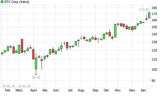 Mit dem Anstieg auf 170,02 EUR hat die Raytheon Technologies-Aktie (ISIN US75513E1010) am 14.01.2026 ein neues All-Time-High erreicht und damit den Kurs vom 13.01.2026 eingestellt.