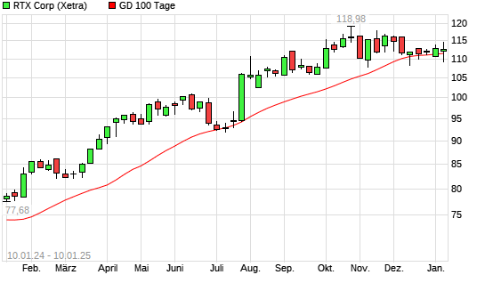 Mit dem Anstieg auf 113,30 EUR hat die Raytheon Technologies-Aktie am 09.01.2025 die 100-Tage-Linie nach oben gekreuzt.