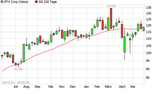 Mit dem Rücksetzer auf 116,00 EUR hat die Raytheon Technologies-Aktie am 28.05.2025 die 100-Tage-Linie nach unten gekreuzt.