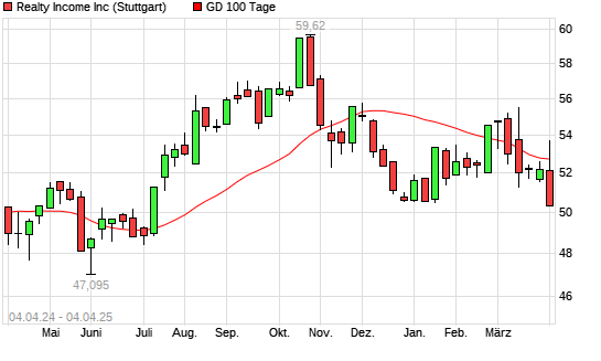 Mit dem Rücksetzer auf 51,72 EUR hat die Realty Income-Aktie am 03.04.2025 die 100-Tage-Linie nach unten gekreuzt.